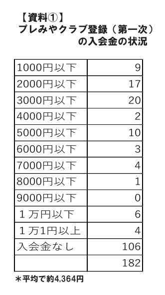 1つは入会金です。各団体は月会費や年会費・チケット制など様々な設定で会費を徴収しています。その1つに入会金があります。資料①をご覧ください。こちらは入会金についてすべての団体を確認した表になります。