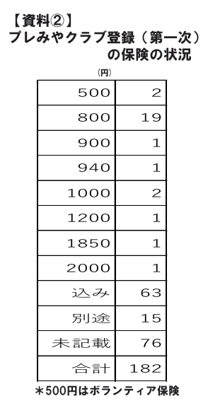 資料②をご覧ください。こちらは各団体の保険に関する考えをまとめた表になります。保険について金額を表記しているのが28団体、費用は概ね年間で800円というものが最も多いですが、ばらつきも見られます。会費込みとしているのが63団体、別途と記載しているのが15団体、未記載が76団体でした。そしてこの保険はすべて受益者負担によるものとなります。