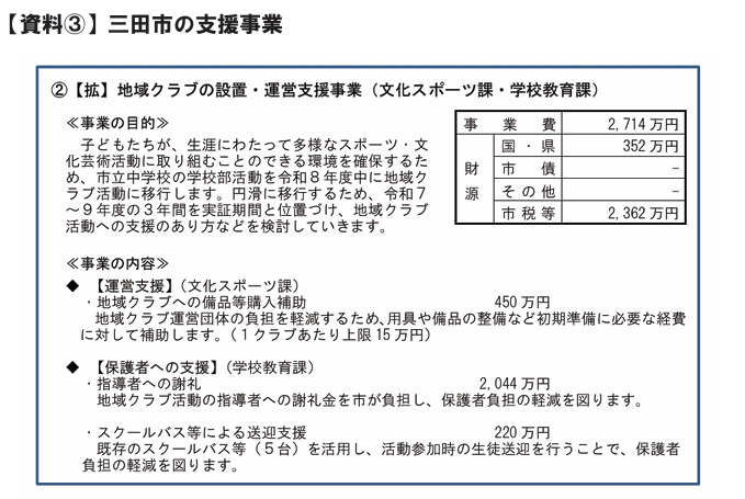 資料③をご覧ください。こちらは三田市の部活動地域展開に関する支援事業の内容です。大きく3つの支援があり、1つ目は1団体につき上限15万円を支援する運営支援、2つ目は指導者への謝礼金を市が負担することを前提に会費を抑える保護者の費用負担軽減支援、最後はスクールバスでの送迎支援、事業費は合わせて2714万円となっています。