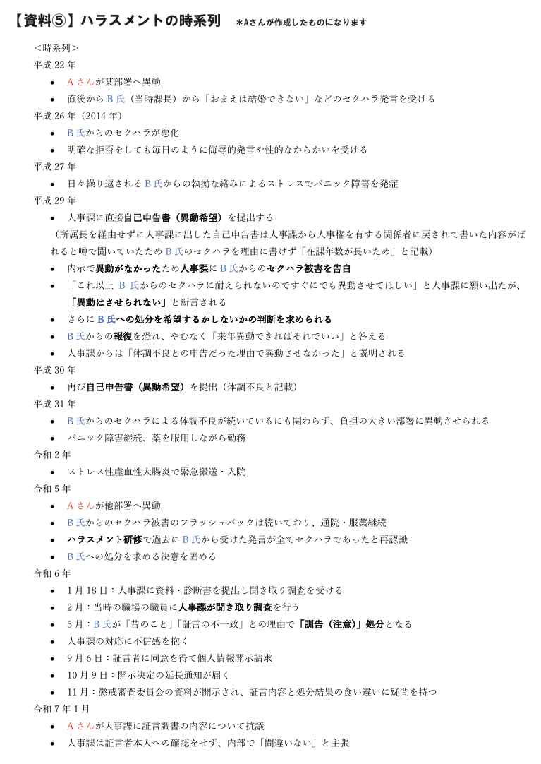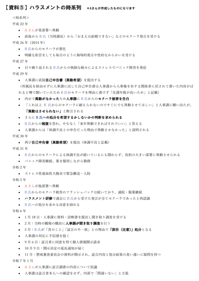 昨年西宮市役所に勤務されている女性の方からご相談がありました。内容は過去にあった上司によるハラスメントについてでした。資料⑤をご覧ください。こちらはその女性が作成したハラスメントに関する時系列です。あくまで、女性の視点で作成された資料であることを申し添えておきます。相談者の女性をA、ハラスメント行為を行ったとされる上司をBと表記しています。